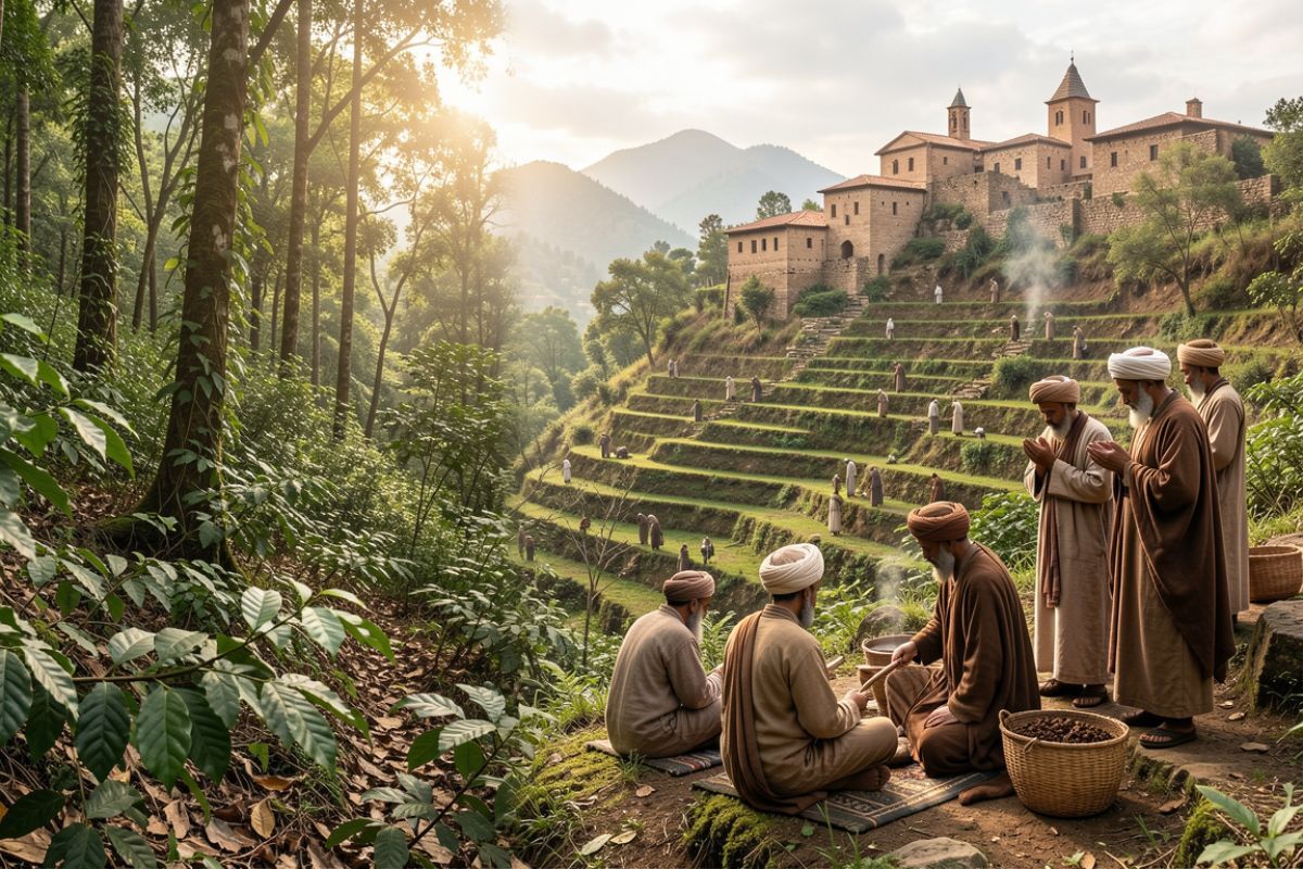 By the 15th century, Sufi monks in Yemen were cultivating coffee plants on the slopes of the Yemeni highlands — the terraced mountain farms of the region known as Al-Makha, or Mocha, which would later lend its name to one of the world's most recognized flavor descriptors. The Sufis discovered that coffee's alertness-producing properties were ideal for their practice of dhikr — extended nighttime devotional sessions involving chanting, prayer, and meditation. Coffee was, from its first intentional cultivation, a spiritual tool as much as a beverage.